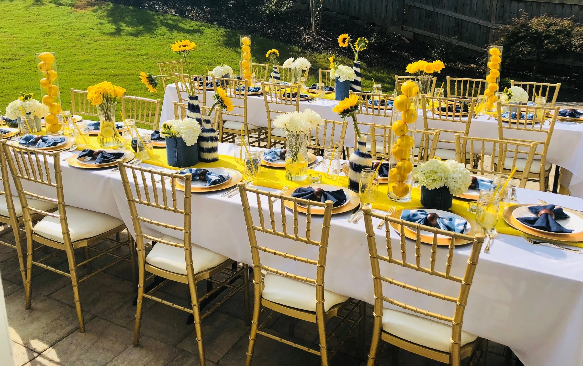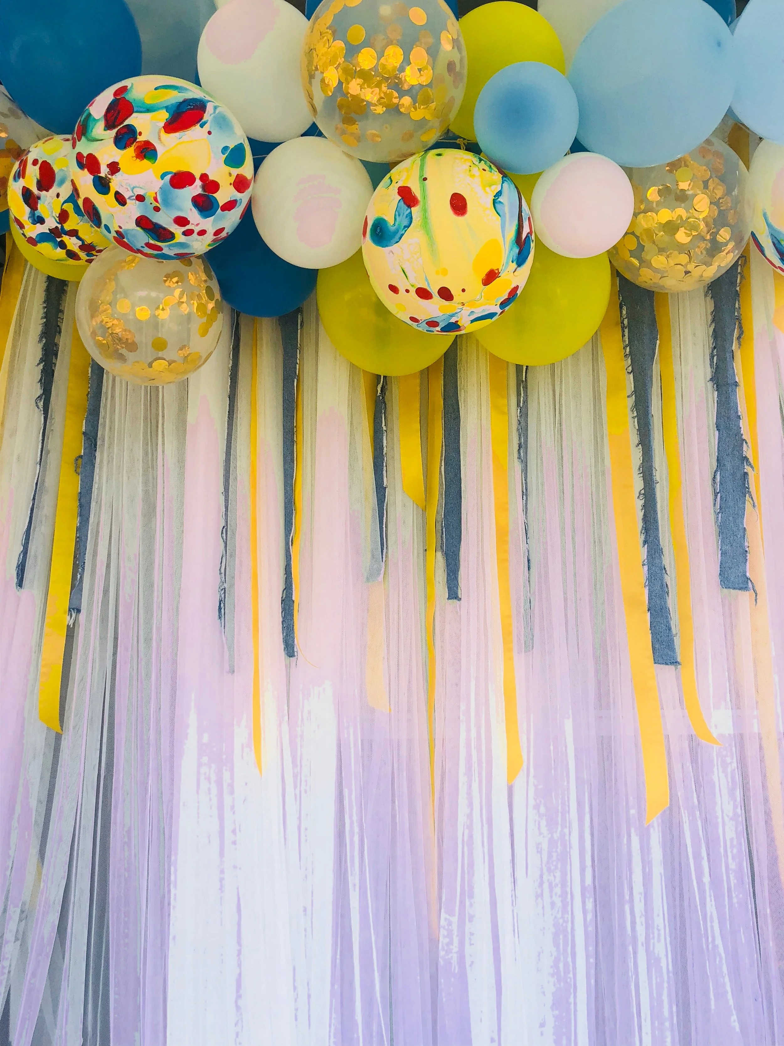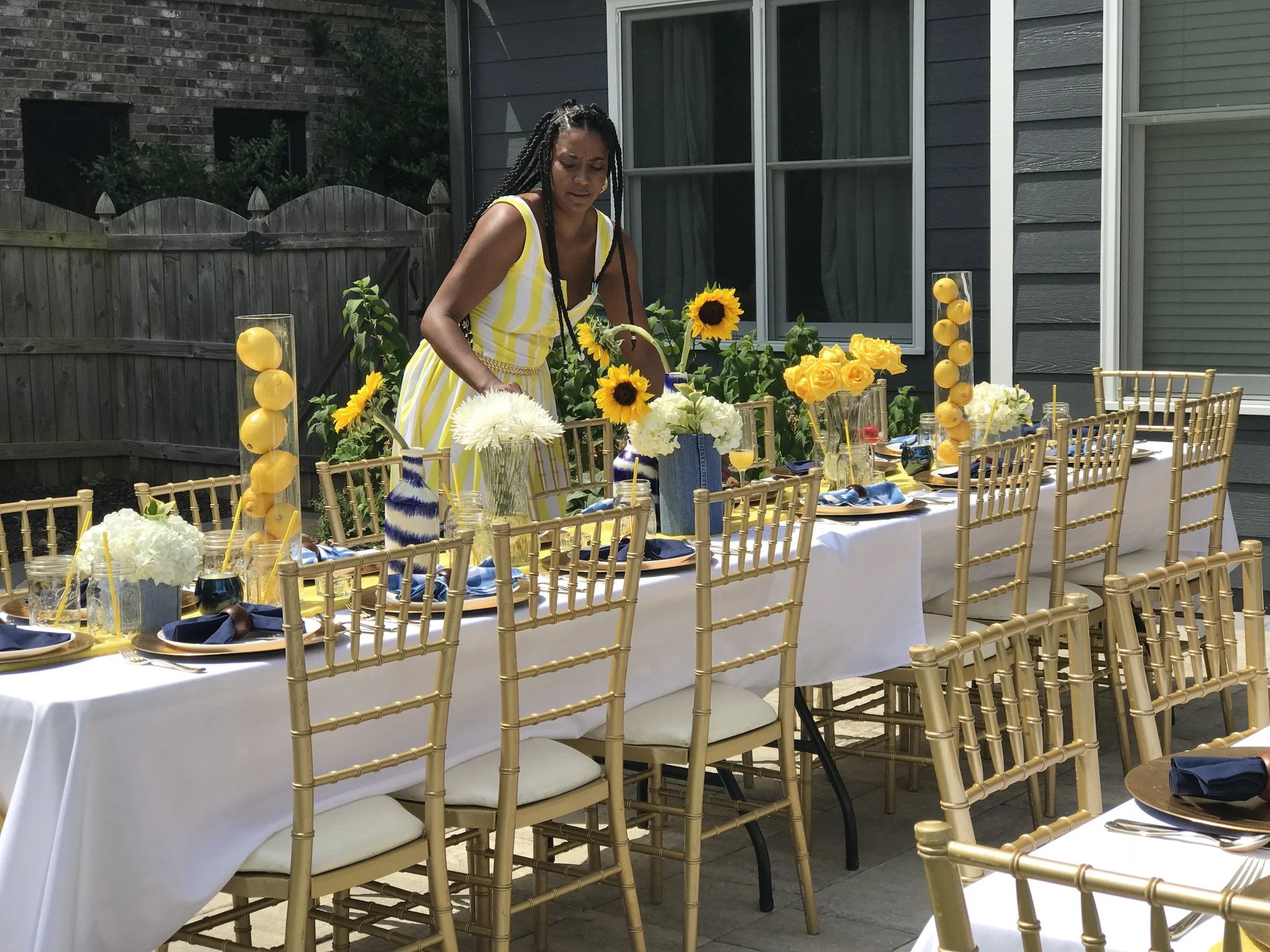 The end of summer is near but not without one last sun-filled vibe. This baby shower brunch decor was EVERYTHING! I'll admit, I can become a bit obsessed with an idea. I get into every little detail, but that's not a bad thing. The hues were yellow, blue and white. From there, I decided denim and lemons would be a major part of the design scheme. From lemon filled tall vases to a custom balloon arch photo booth and denim covered vases I created myself -- no detail was spared. Fresh flowers are always a must because I am a flower child a.k.a. the daughter of an amazing florist…my Mommy. The outcome was gorgeous!